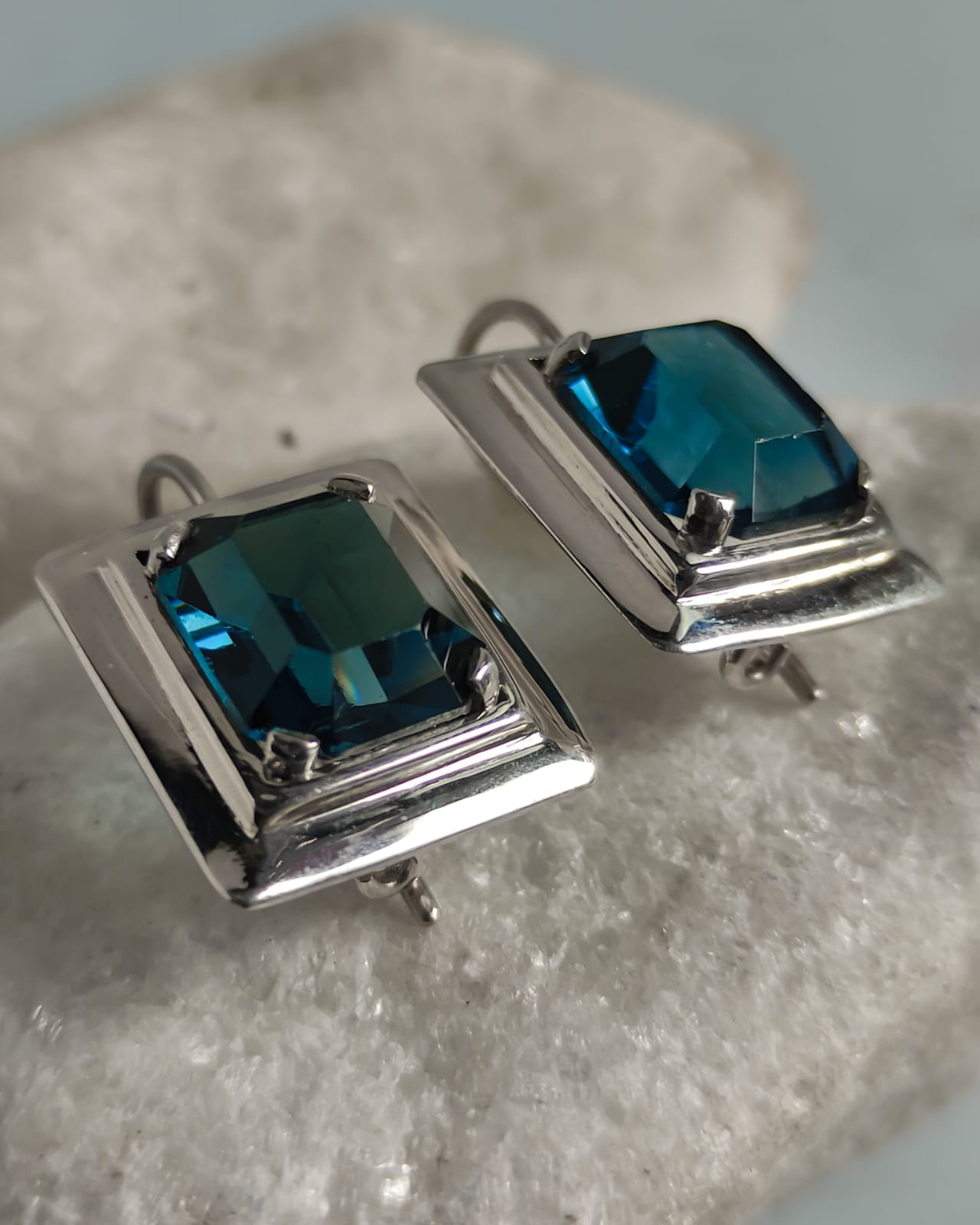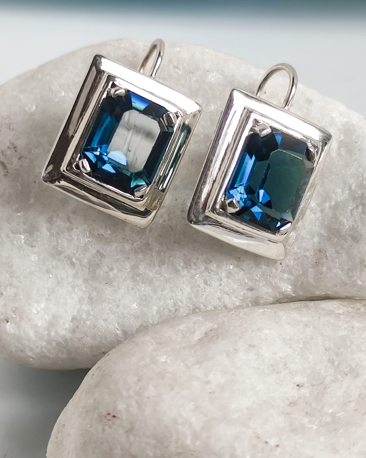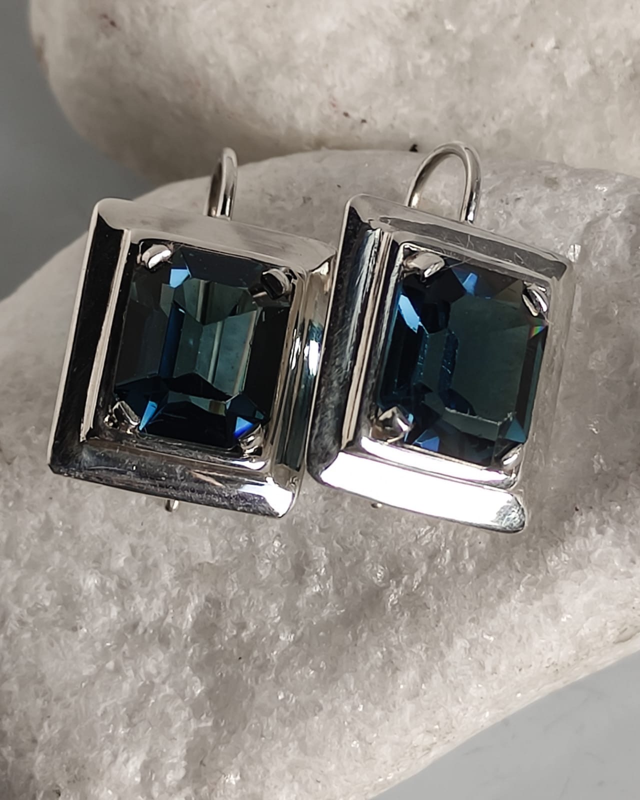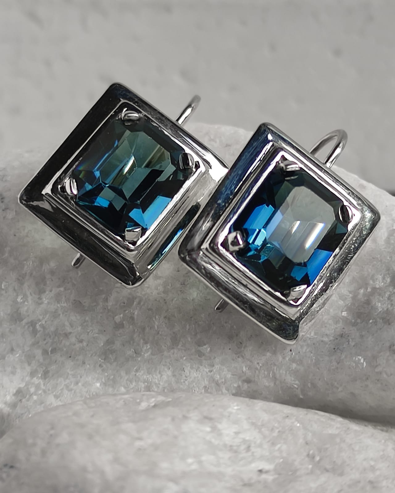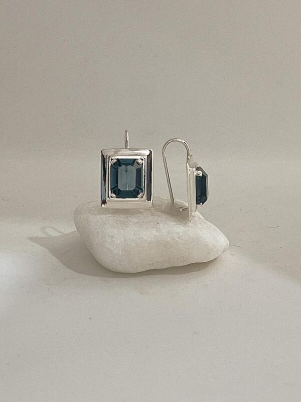 Brinco Retangular 1,6 x 1,8 cm em Prata 950 com Swarovisk Azul Royal 1,1 x 1,3 cm